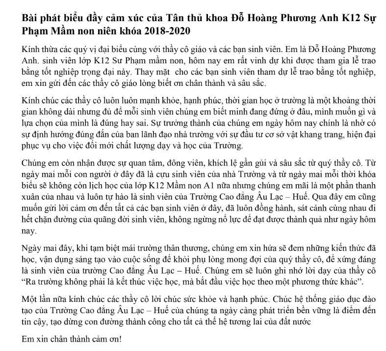 Tân khoa Đỗ Hoàng Phương Anh lớp K12-MN-B1 thay mặt cho các bạn học sinh gửi lời cảm ơn đến ban lãnh đạo nhà trường, thầy cô đã không ngừng giúp đỡ, định hướng đúng đắn, truyền đạt kinh nghiệm trong quá trình học tập , những người bạn đã luôn đồng hành cùng nhau đi hết chặng đường và đặc biệt luôn ghi nhớ lời dạy của thầy cô “Ra trường không phải là kết thúc việc học, mà bắt đầu việc học theo một phương thức khác”.
