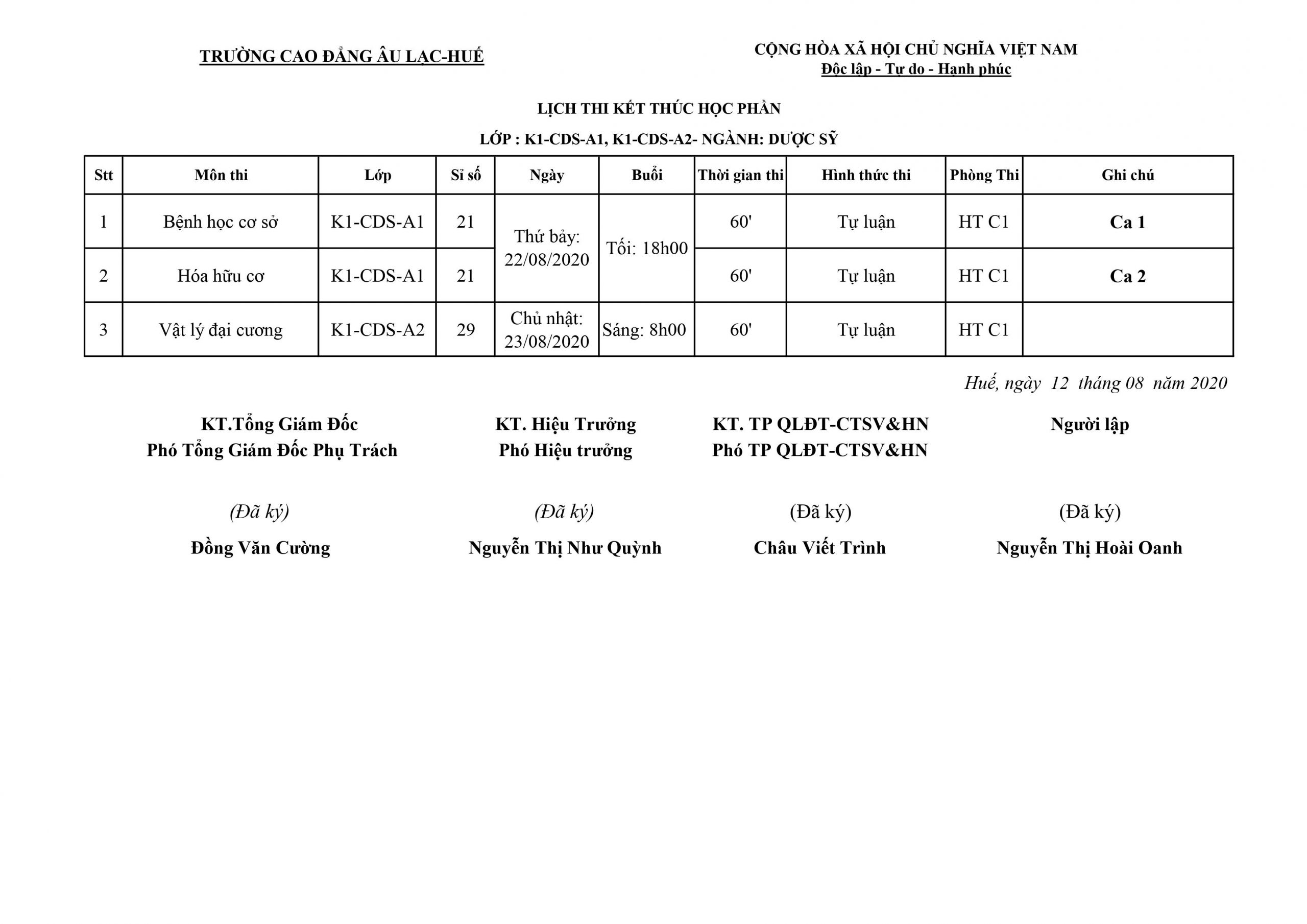 Thông báo lịch thi kết thúc học phần lớp K1-CDS-A1 , K1-CDS-A2